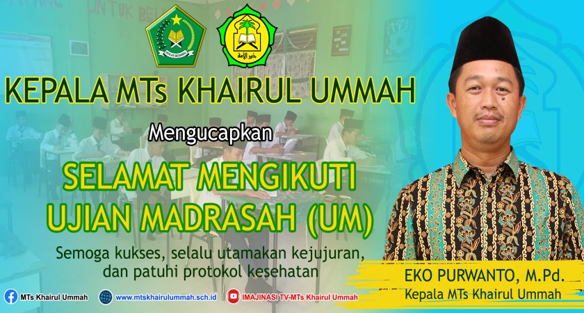 Berhubungan dengan hal tersebut, Kepala Madrasah Tsanawiyah Pondok Pesantren Khairul Ummah Ustadz Eko Purwanto, M.Pd mengucapkan kepada semua santri/siswa,"SELAMAT MENGIKUTI UJIAN MADRASAH".